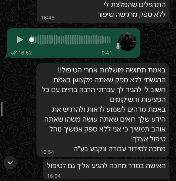 יאאא חיים שלי אתה ברור מה!! ואני רציתי להגיד לך שמה שאמרתי בסוף אני לוקחת חזרה על הריג׳קטים אני חושבת שאיך שעשית זה היה בדיוק במינון הנכון של החוזקה כנראה שלא תמיד חייבים להרגיש כאבים (אתה בטח יודע יותר טוב ממני) כדי להרגיש שעשיתי עיסוי בפעם שעברה שעשיתי עשו לי כלכך חזק שזה שבר אותי לאיזה שבוע ובגלל זה פחדתי לעשות שוב ועכשיו אחרי הטיפול שלך אני ממש מרגישה שינוי לטובה ובנתיים ללא כאבים בכלל ממה שהיה ואיזה כיף לי להבין שאפשר גם להנות מזה אמרתי לך שיש לך ידיי קסם! תמשיך כמו שאתה ואני בטוחה במליון אחוז שאתה תצליח יותר ויותר! אז תודה לך🫶🏼